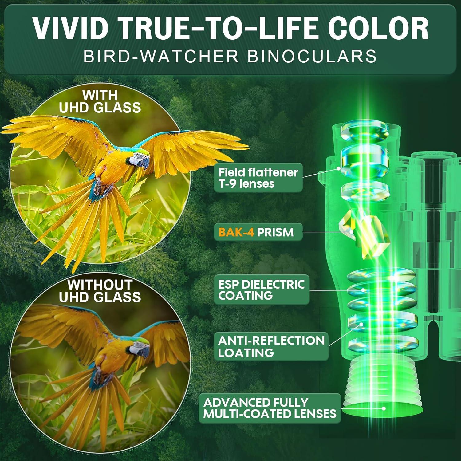 【BAK4 Prism for Superior Image Quality】These compact and powerful binoculars for bird watching are equipped with Bak4 prisms and multi-coated lenses, ensuring sharp, vivid, and lifelike visuals. With excellent light transmission, you can appreciate clear and delicate images even in low-light conditions with our small binoculars.