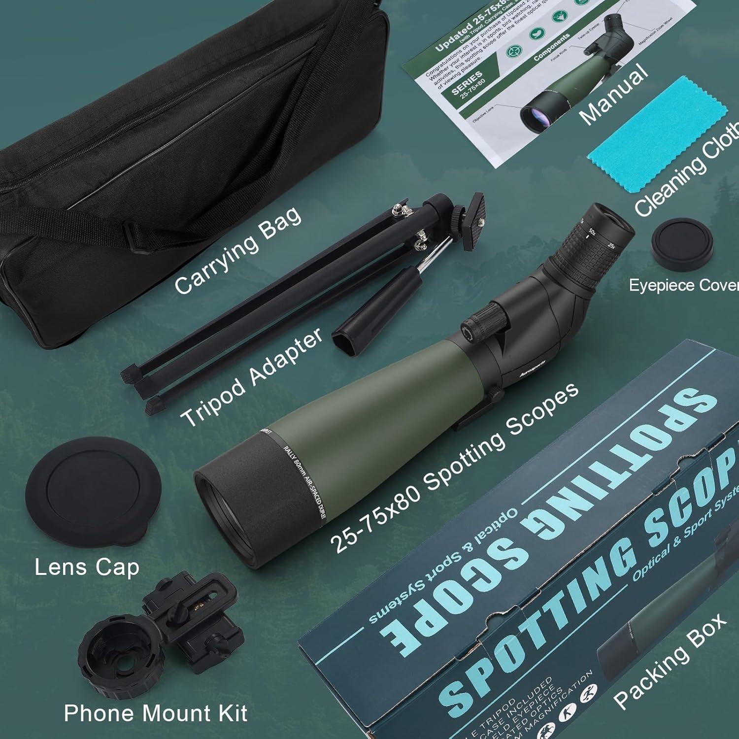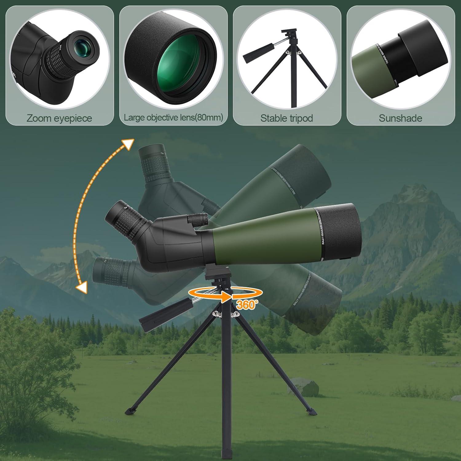80MM LAGRE VIEW OBJECTIVE LENS TO CAPTURE MORE LIGHT – This HD spotter scope lens feature fully multi-coated and BAK4 prism to increases light transmission and delivers bright and clear images even in low-light conditions. Compared to the 60mm and 70mm objective lenses with a spotting scope, the 80mm objective lens captures more light and provides a field of view of 83-48 feet/1000 yards, allowing you to observe a wider view.
